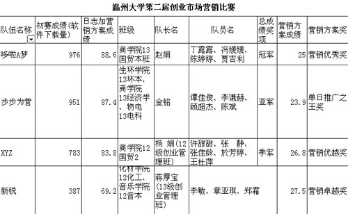 现场的评委有来自温大各学院的老师,以及温州仁和人力资源开发公司刘晓聪总经理,还有哆啦宝(北京)科技有限公司相昌峰副总经理,yl23411永利集团创业学院办公室主任施永川老师,商学院教授肖文旺老师,商学院教授杨龙志老师。出席本次活动的嘉宾有yl23411永利集团创业学院创业班班主任张瑶琴老师,创业园负责人黄少伟老师,KAB俱乐部主席周丹阳,温大创业协会会长王伦,哆啦口袋温州负责人武月,掌上茶山负责人温作鹏等。大赛现场虚无坐席,决赛的形式为初赛进入前十五名的队伍,上台演讲5分钟,台下评委提问并点评3分钟,现场激烈万分,经过两个小时激烈比拼,哆啦A梦”队获得冠军,“步步为营”及“XYZ”队分别获亚军和季军。营销卓越奖、营销优越奖、营销优秀奖分别由“新锐”队、“XYZ”队、“哆啦A梦”队获得,“ “单日推广之王”奖由步步为营队获得。