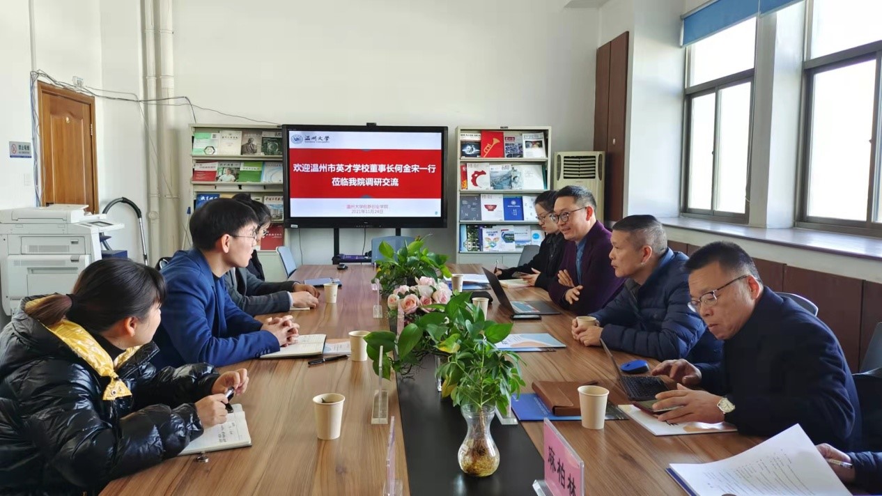 2021年11月24日上午,温州市教育技术中心办公室主任黄祥风、温州英才学校董事长何金宋、校长吴长青等莅临我院开展调研交流。