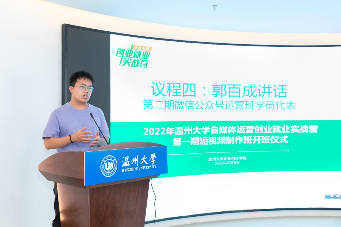 最后一项议程由作为微信公众号运营班的学员代表郭百成发言,郭百成是yl23411永利集团人文学院19级广告学生,这是他第三次参加yl23411永利集团创业班级,在办公司的时候他发现微信公众号运营的重要性,有些经营涉及的业务也跟微信运营有关。2020年他参加我们学院举办的流媒体运营班后继续参加了2021年从零基础开始学直播班,之后百成自己创办了浮白传媒工作室并入驻温大创业园,现工作室有7位工作人员,这次开班他说作为学员应该认真投入到此次课程中,学习新媒体知识技能,时代在改变我们更应该改变自己,穷尽设计之妙 ,习得傍身之技,在未来互联网浪潮里欣起新的篇章。