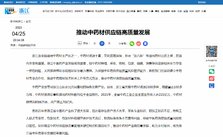 近日,我院叶未央博士撰写的题为《推动中药材供应链高质量发展,助力乡村振兴》研究报告获浙江省农业农村厅王通林厅长的肯定性批示。据悉,该研究成果曾被《经济日报》中国县域经济报理论周刊登出,并被新华网转载。