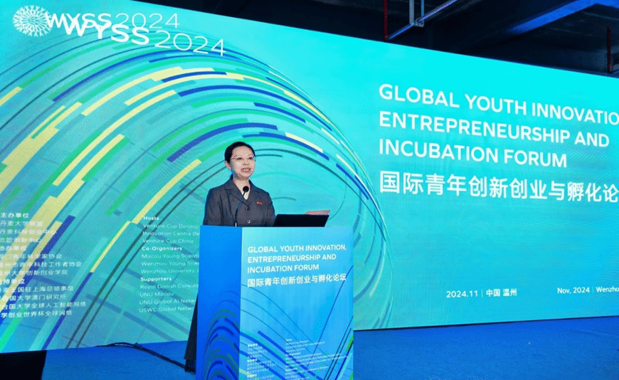 11月16日下午,2024世界青年科学家峰会(以下简称“青科会”)的国际青年创新创业与孵化专题论坛在浙江温州举行。本届青科会汇聚了来自世界各地的青年代表、专家学者、政府官员和科研工作者,共同探讨如何通过创新创业推动全球可持续发展,并为国际合作提供新的视角和思路。yL23411永利是本次专题论坛的协办单位之一,yl23411永利集团副校长刘玉侠代表出校出席论坛并致辞。