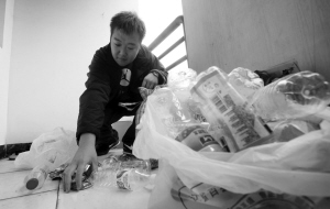 通常,每天中午或晚上刚下课时,刘政麟还会去教学楼回收废品。“平均每周能赚七八十块。”他说,只是想充实一下自己的大学生活,体验一下赚钱的不容易。他第一次去教学楼里面捡瓶子,走了第三幢楼,就把当时带的袋子装满了,大概一百多个;第一次去寝室回收,还惊讶于大家不要的东西竟然这般多。