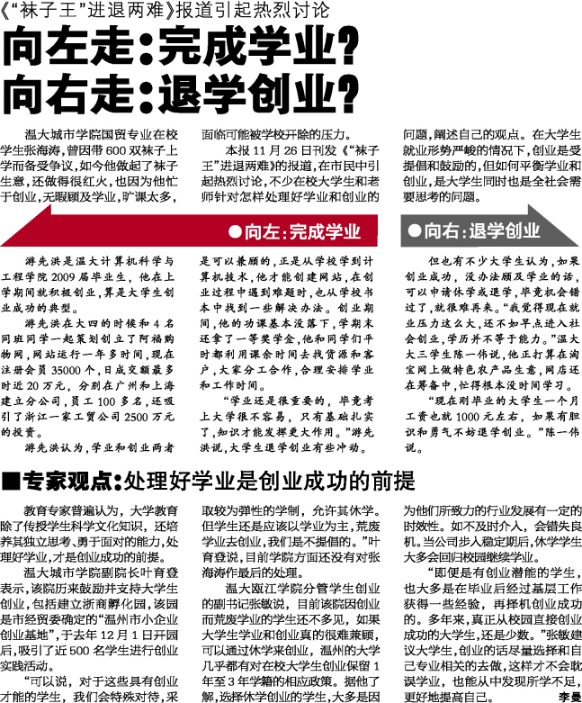 温州都市报:向左走:完成学业? 向右走:退学创业?
