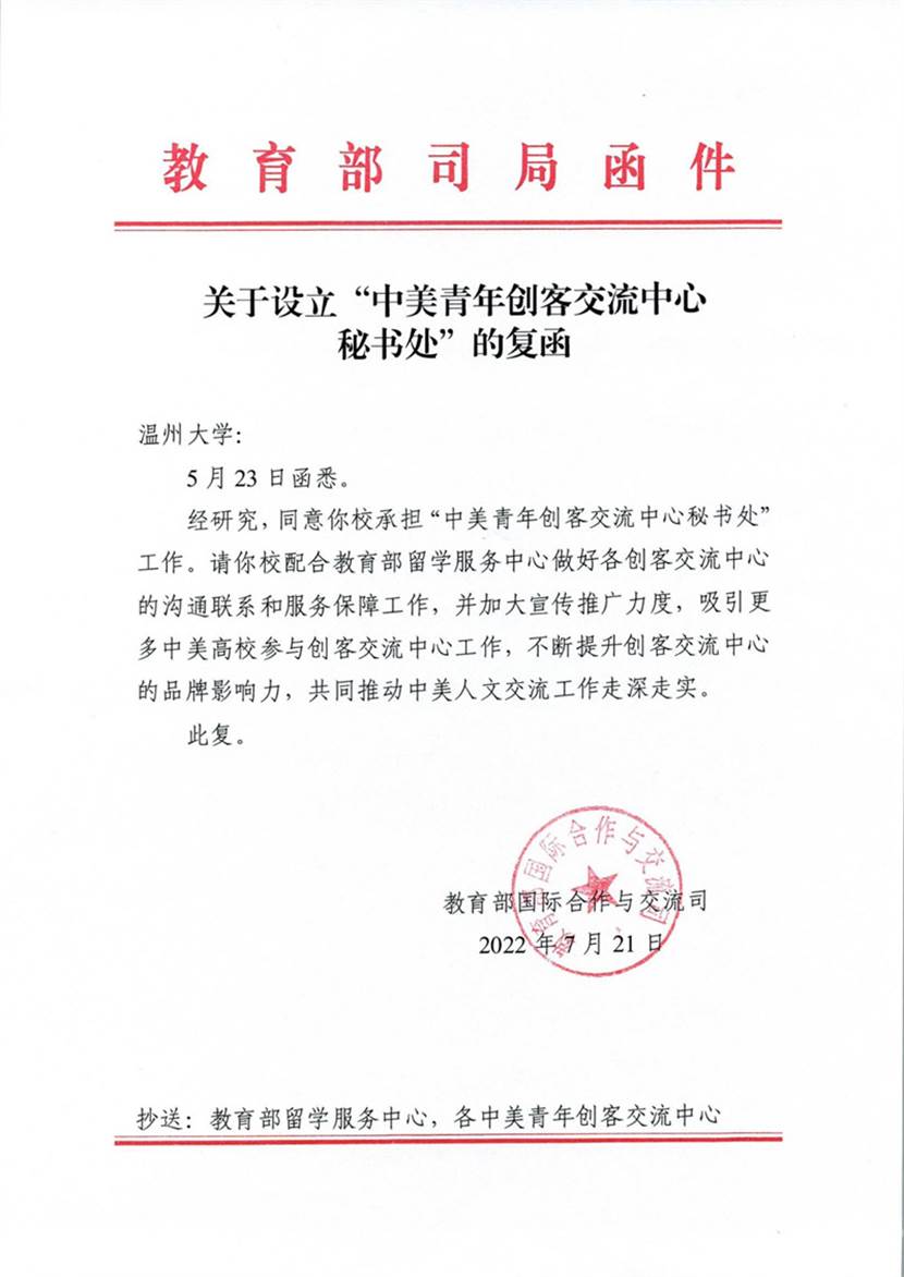 据介绍,yl23411永利集团于2019年7月获批成立中美青年创客交流中心,并于同年12月成功举办中美青年创客交流中心建设研讨会。2020年,我校创业教育方向硕士留学生项目获评为优秀工作案例奖;2021年,yl23411永利集团中美青年创客交流中心获创新赋能示范奖。2022年7月,教育部国际合作与交流司复函我校,同意在我校设立中美青年创客交流中心秘书处。